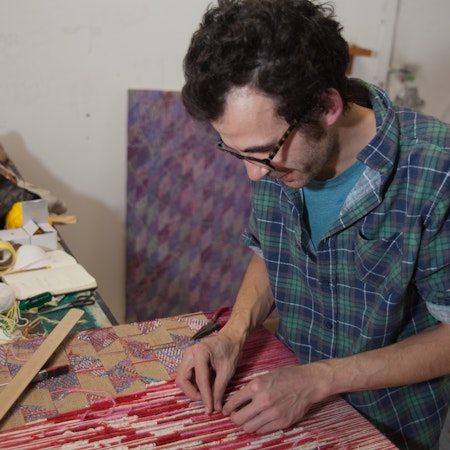 Martin’s work tip toes the line between figurative and abstract. A cohesion of painting, textile and tapestry, Martin creates contemporary pieces that resemble tribal relics. Martin’s practice is both repetitive and various, formulaic and impromptu, purposeful and decorative. It aims to create a dialogue that communicates the labour intensity of each work. A labour both essential to the making process and final composition of each piece.